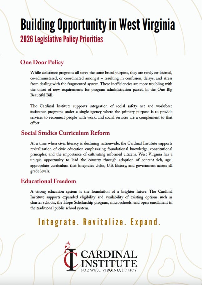 The Cardinal Institute for West Virginia Policy works alongside Mountaineers to build a West Virginia Miracle founded on economic freedom, education freedom, worker freedom, and a culture of freedom enshrined in the state motto: Mountaineers are Always Free.
